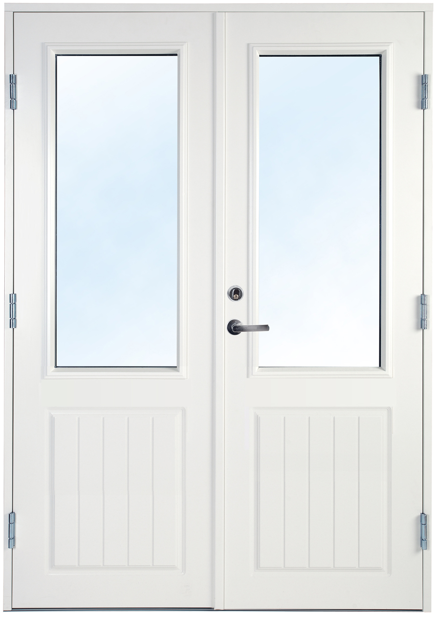 Dørene er dekorert i bunnen både på innsiden og utsiden. Vinduene er doble isolerruter med Argon, noe som gir lav U-verdi.