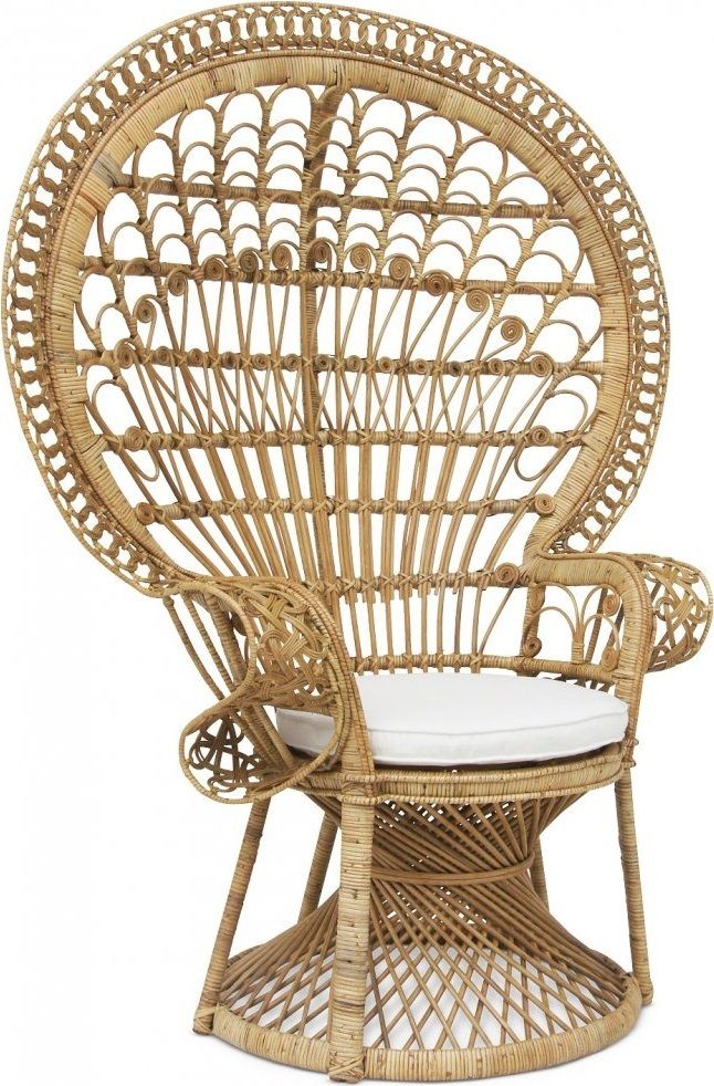 Opplev en følelse av eleganse med vår påfugl lenestol, et klassisk møbel laget av flettet og bundet naturlig rotting. Dette fantastiske håndarbeidet sikrer langvarig holdbarhet og skjønnhet. Lenestolen er utstyrt med en rund sittepute i lett stoff som gir både komfort og et stilig preg til ditt interiør.