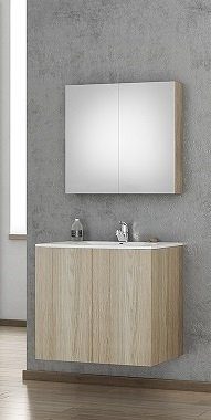 Primo møbelpakke fra Nordamist med et veggmontert servantskap i lys treimitasjon, porselenservant og speil.