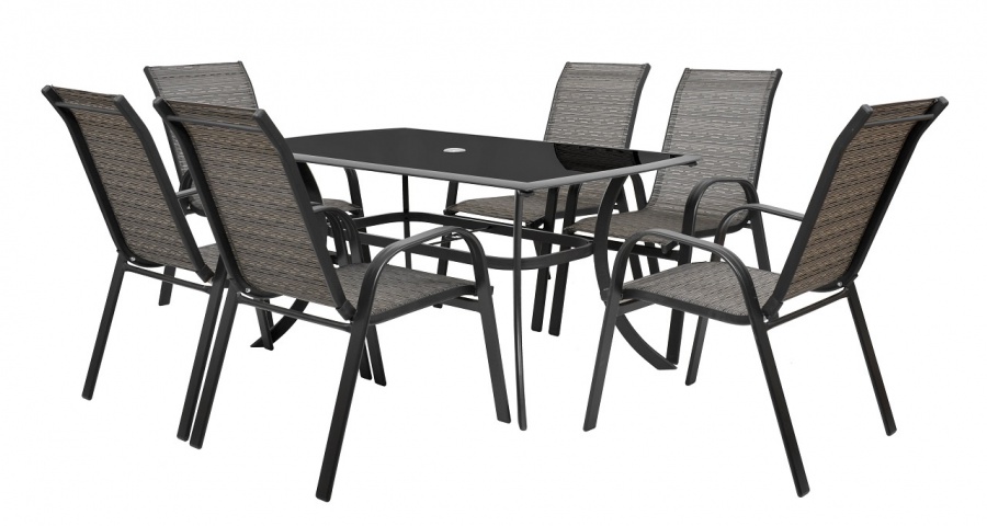 Hagemøbler i aluminiumsprofil. Sett med 6 stoler (stables) og et bord (med sort glassplate). Passer til skjermede hager, under terrassetak og lignende. Ikke egnet for våte steder.