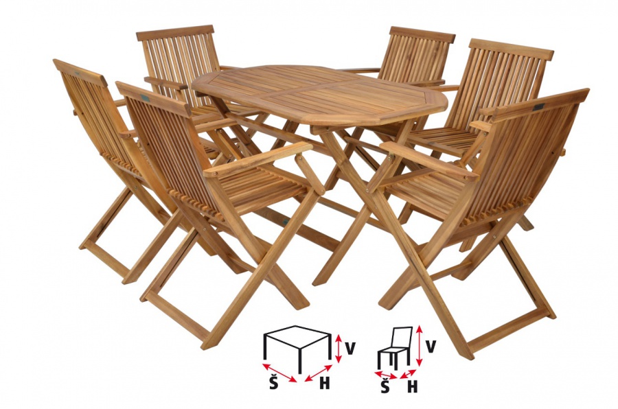 Tresorten er akasietre og skal oljes ved bruk i utemiljø. Denne gruppen inkluderer 6 sammenleggbare stoler.
