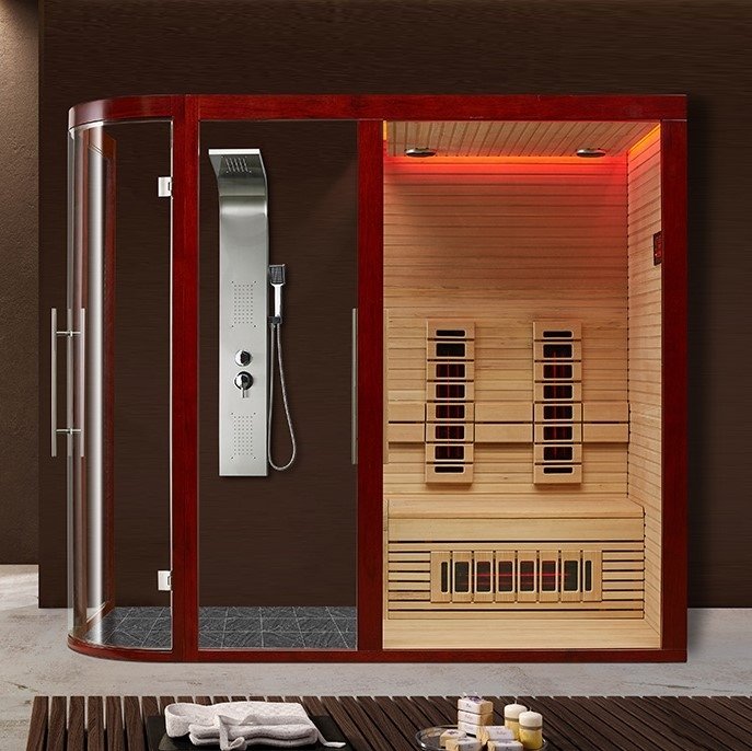 Kombinasjon av dusjkabinett og infrarød badstue. Badstuen har inngang direkte fra dusjen og passer for to personer. Denne nydelige kombinasjonen er perfekt i store baderom.
