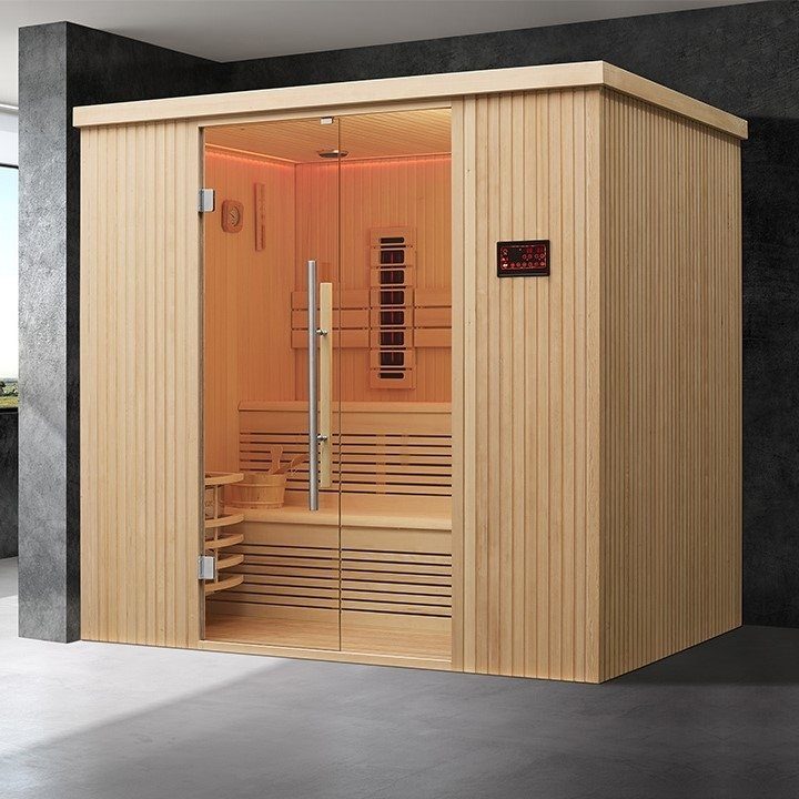 Denne badstuen er for deg som virkelig vil få så mye som mulig ut av badstubadet ditt. Kombinasjonsbadstuen har både en kraftig badstueovn og effektive infrarøde kullfibervarmere. Badstuen passer til 4-6 personer.