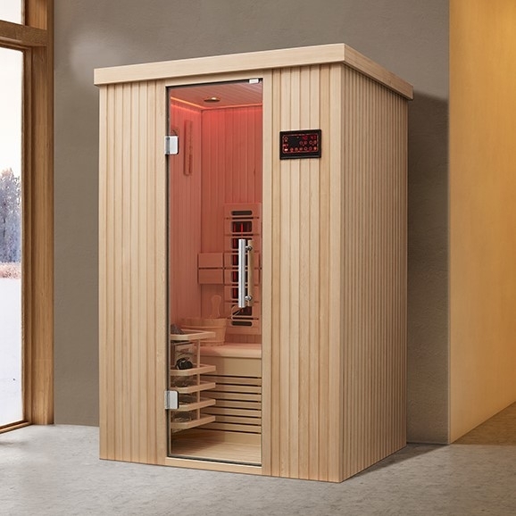Denne badstuen er for deg som virkelig vil få så mye som mulig ut av badstubadet ditt. Kombinasjonsbadstuen har både en kraftig badstueovn og effektive infrarøde kullfibervarmere. Badstuen passer til 1-2 personer.
