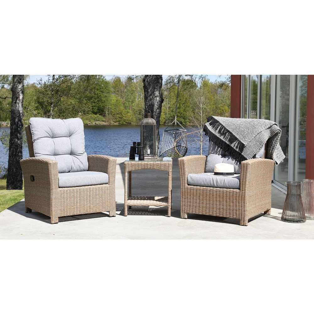 Lenestolsett Dallas i modern design. Setet består av två ställbara fåtöljer og ett nätt sidobord med glastoppskiva, allt i matchande naturfärgad konstrotting. Passer godt til avkobling ute på uteplassen, terrassen osv. Inkludert lysegrå puter. Dobbeltvevd halvrund kunstrotting.