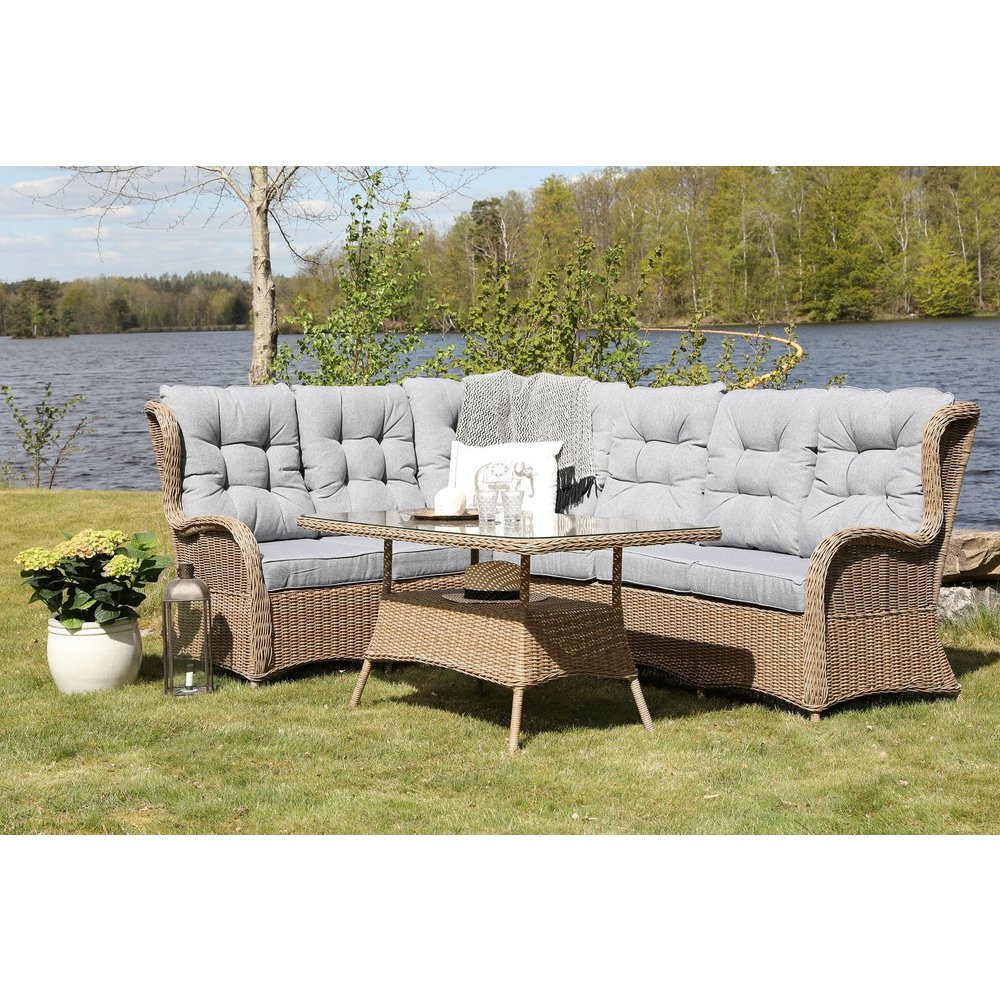 Orleans gir deg en utemøbelgruppe i klassisk naturfarget kunstrotting. Møbelgruppen består av bord og hjørnesofa, med tilhørende lysgrå puter. Materialene er en holdbar ramme i aluminium som klarer utemiljø med dobbeltvevd halvrund kunstrotting. Bord med glasskive for enkel rengjøring.