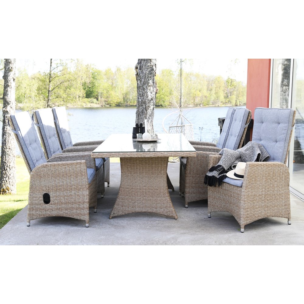 Spisegruppe for utemøbler. Sienna spisebord i naturfarget rottingfarge samt 6 st justerbare lenestoler fra Sienna. En sposegruppe i harmoni der møblene går fint sammen og skaper en helhet som er vanskelig å matche.