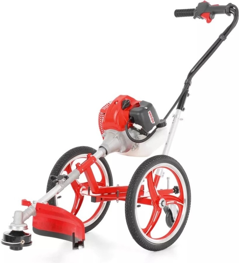 Bensindrevet gressklipper med klippehode (klippetrås er inkludert). Drift, 2-takts 52 cc bensinmotor. Takket være hjulene avlaster du ryggen og klipper i lengre perioder.