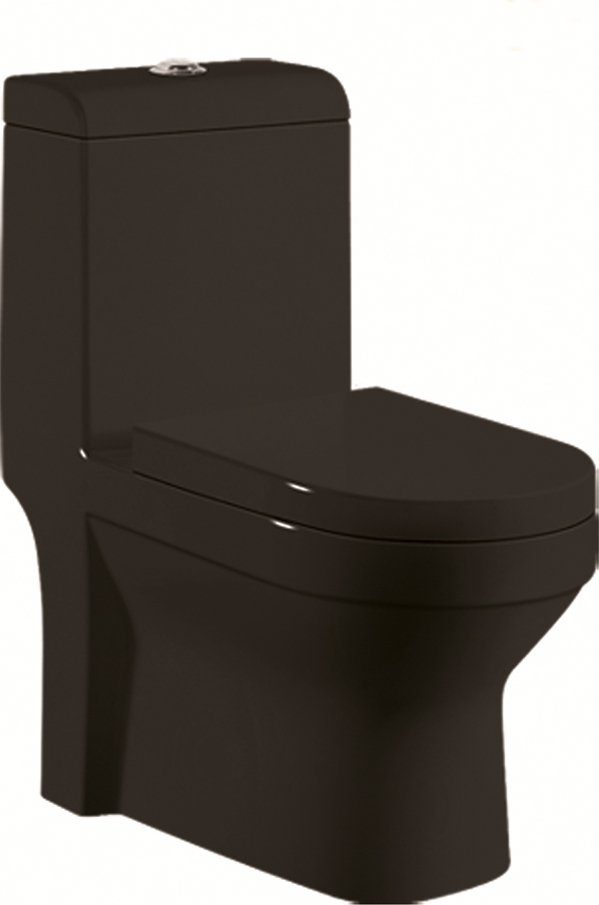 Svart toalettstol med sølvfarget spyleknapp og rengjøringsvennlig glasur.