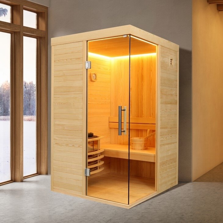 Komplett badstuepakke med badstuevarmer og kontrollenhet. Badstuen passer for 2 personer. Kontrollenheten har funksjoner for musikkavspilling via Bluetooth og FM-radio, samt funksjoner for temperatur- og tidskontroll.