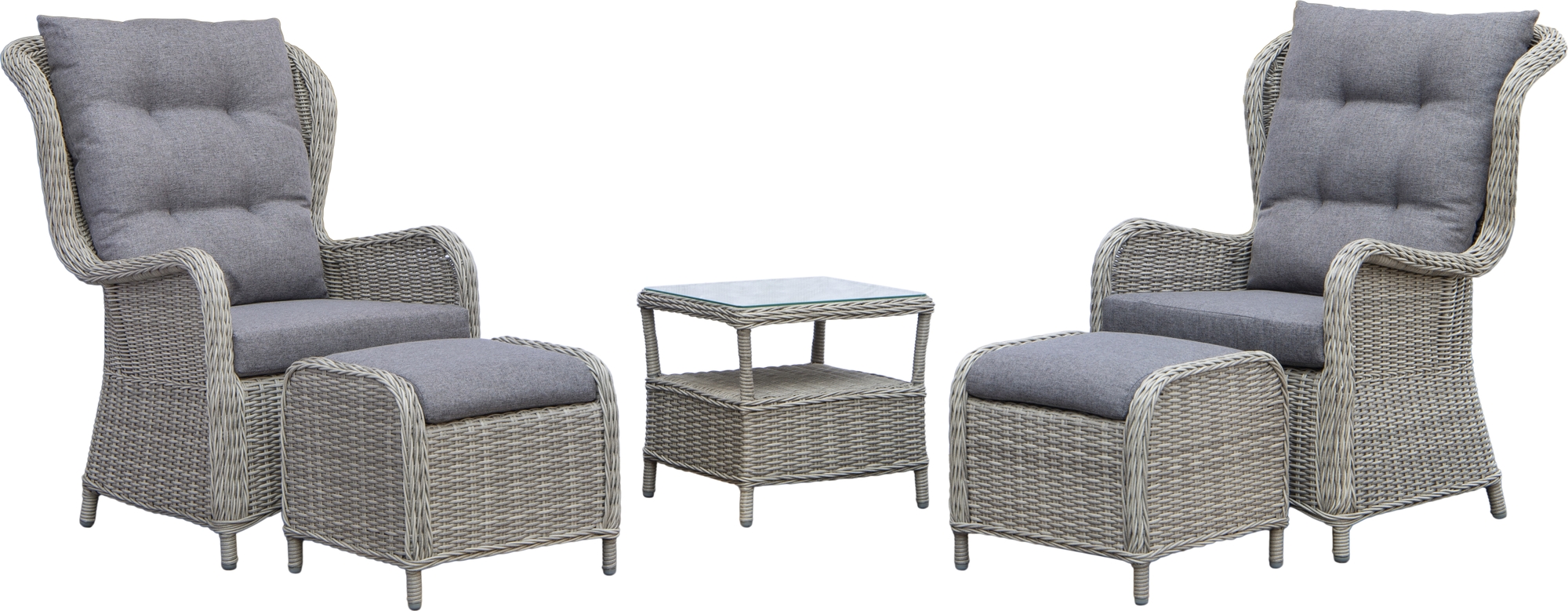 Sett bestående av 2 stk. komfortable lenestoler (med fotskamler) i grå rund kunstrotting med grå puter. Inkluderer også et lite bord i matchende kunstrotting.