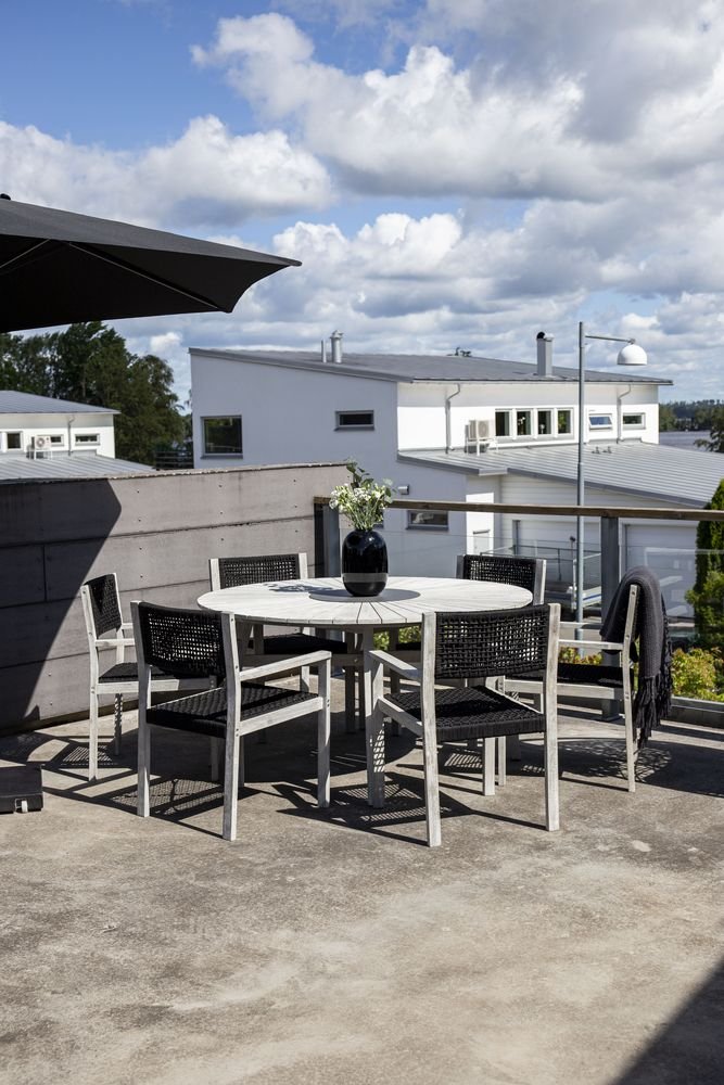 Bord laget av antikkhvit akasie med steinplate i midten.