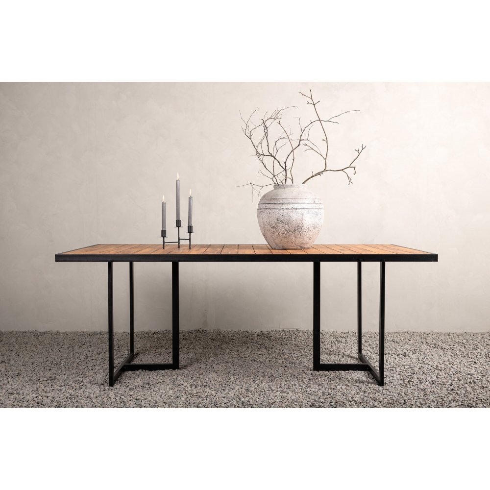 Spisebordet er et stilig og robust bord i brun akasie, med en dekorativ ramme og en stabil base i svart stål. Kombinasjonen av naturlig treverk og industrielle detaljer gir et moderne og innbydende uttrykk som passer like godt i hagen som på terrassen. Her kan du samle familie og venner og nyte alle sommerens fantastiske øyeblikk.