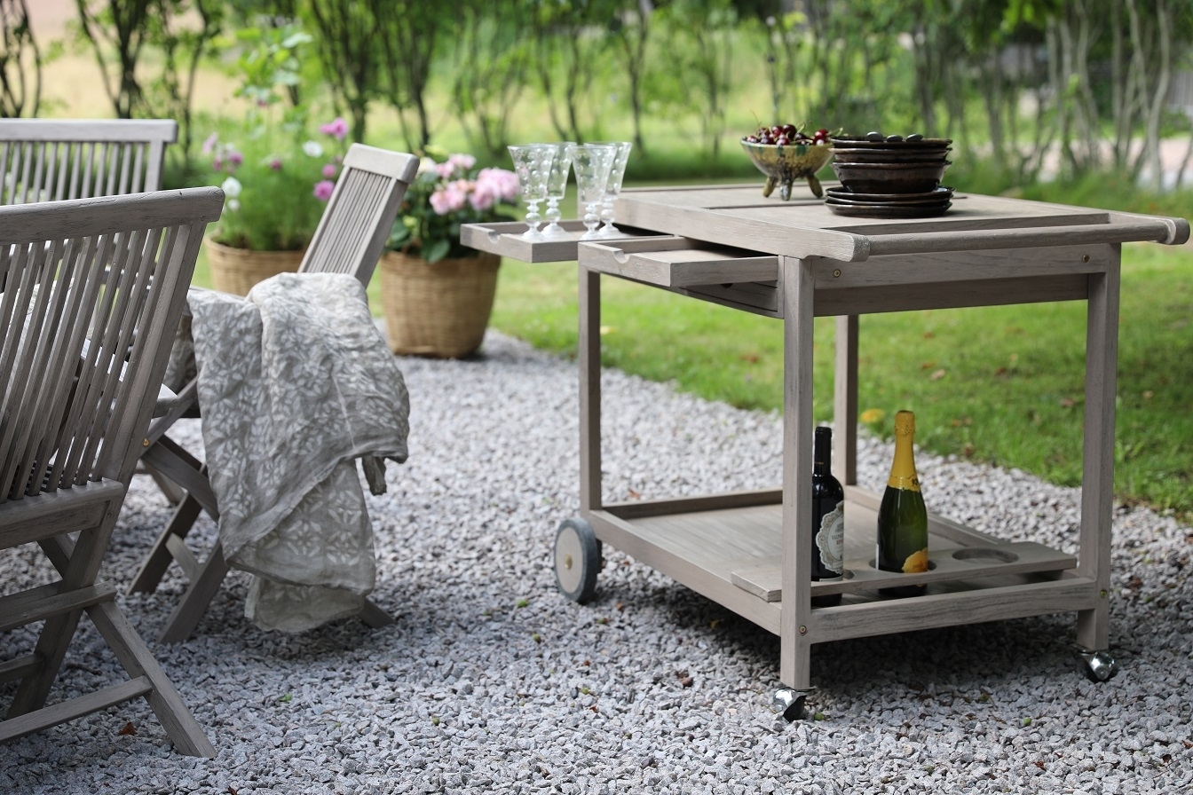 Serveringsvogn i massiv grå teak med hjul som gjør at det enkelt kan flyttes. To hylleplan, fire skuffer samt flaskeholdere. Saltö er en klassisk serie møbler produsert i oppgradert teak.