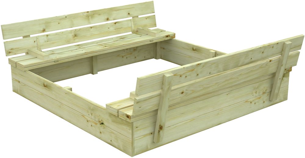 Sandkasse laget av grønn dyptimpregnert nordisk gran. Praktisk lokk som kan felles ut til sitteplasser. Underlag til sandkassen kan kjøpes til.