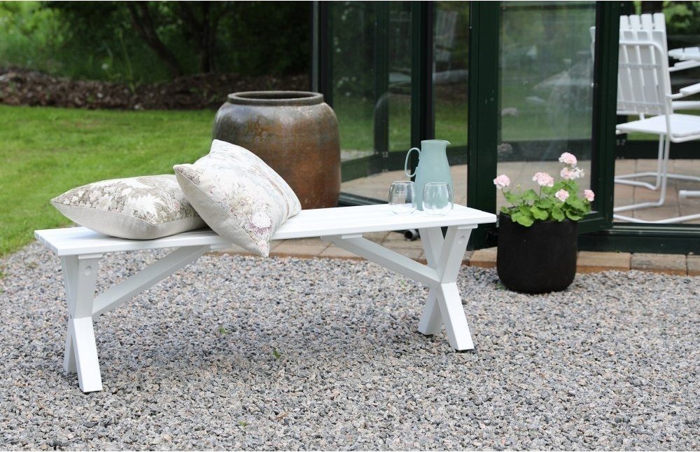 Benk fra Skånska Möbelhuset i hvitmalt furu med kryssbein. Stilig og passer inn i de fleste miljøer. Kompletter gjerne med et av bordene i møbelserien Scottsdale.