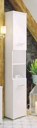 Sideskap fra møbelserien Bari. Møblene er laget av MDF med sidepaneler i hvitt laminat og skap i hvit lakk.