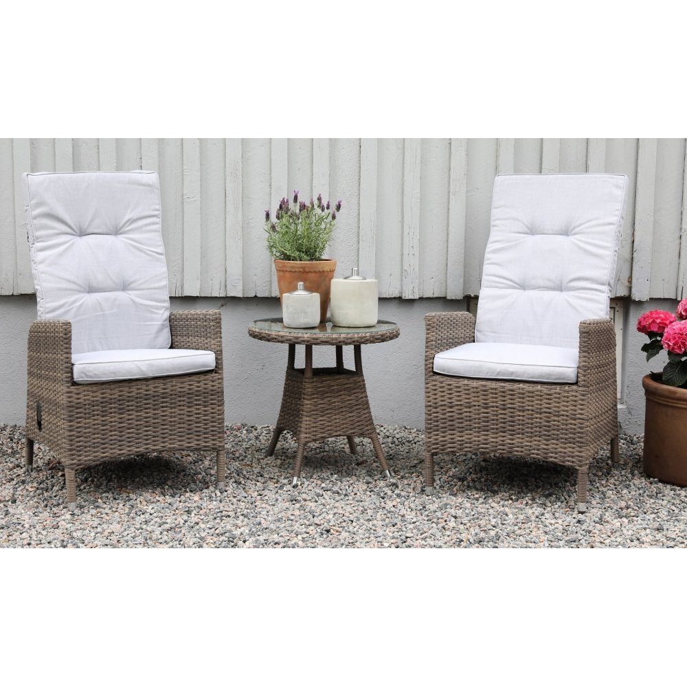 Sienna relaxsett bestående av 2 justerbare lenestoler i whitewash kunstrotting med grå puter av polyester for god komfort. Holdbar ramme av aluminium. Kommer også med et matchende bord i rotting med topplate av glass.