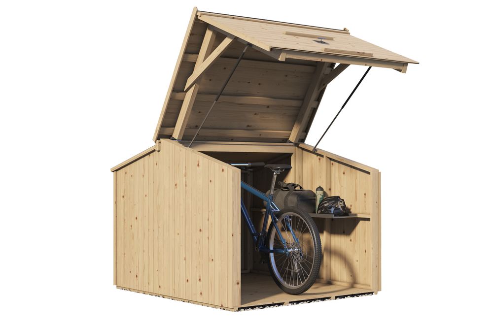 Dette sykkelskuret leveres som et komplett sett og er enkelt å montere etter den medfølgende tegningen. Skuret er i laftet tømmer og er både lettmontert og stabilt. Alt materiale leveres ubehandlet, så det anbefales å behandle med olje, grunnmaling eller dekkfarge så tidlig som mulig. Inkludert alt du trenger for montering, dvs. spiker, skruer etc.
