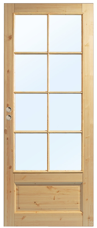 Vanlig skyvedør i massiv furu med stort glassparti.