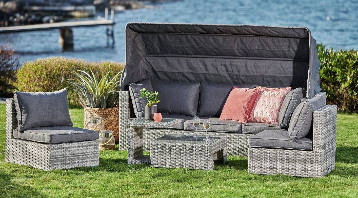 Easy Living By Martinsen, Slättvik er et byggbart system bestående av sofa med innebygget soltak, to lenestoler, salongbord og sidebord. Den sjenerøse 3-seter sofan har et praktisk trekk for å beskytte mot solen. De to frittstående lenestolene kan settes sammen med 3-seter sofaen for å bygge en hjørnesofa. Salongbordet og sidebordet har begge topplater av herdet glass.