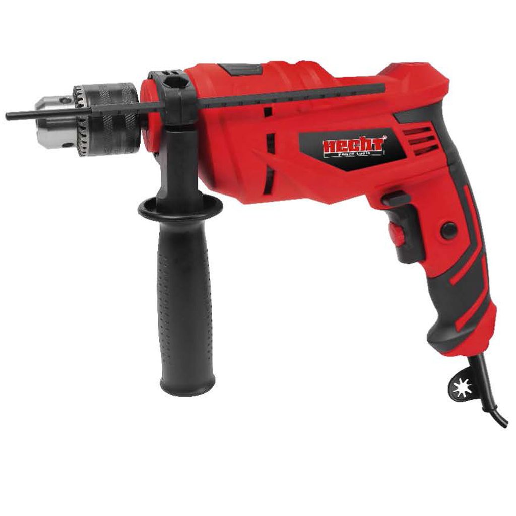 Elektrisk slagbormaskin med variabel hastighet, nøkkelchuck, ekstra håndtak og boredybdemåler.