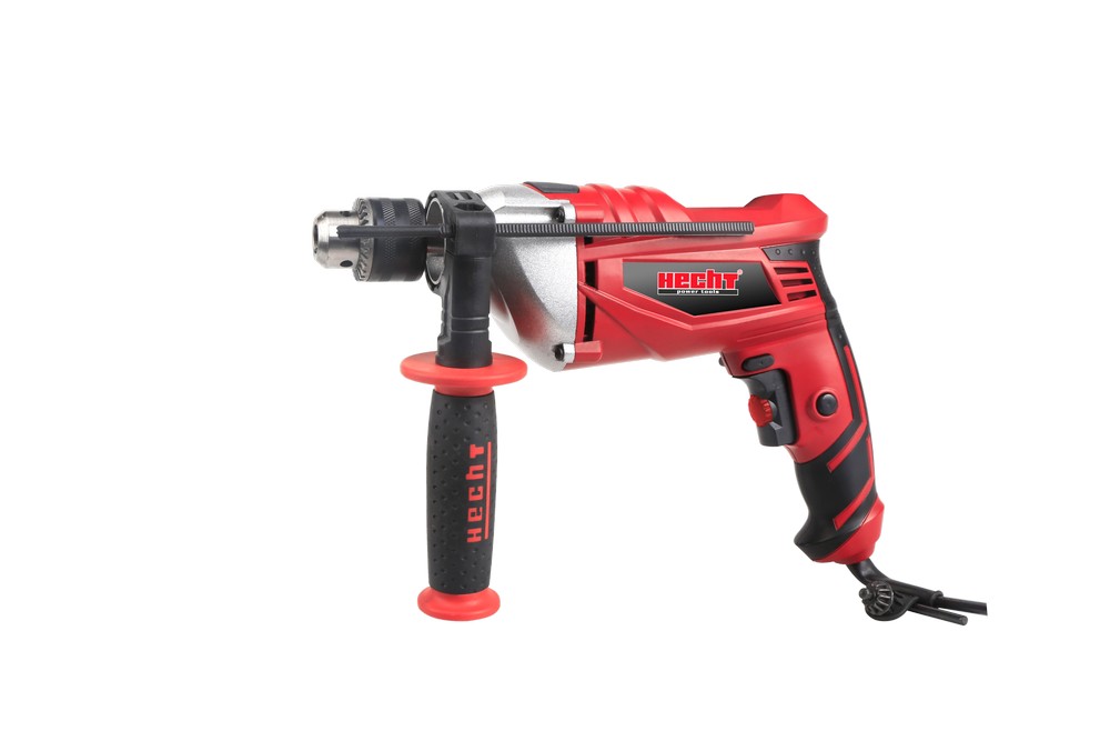Elektrisk slagborrmaskin med variabel hastighet, nøkkelchuck, ekstra håndtak og boredybdemåler.