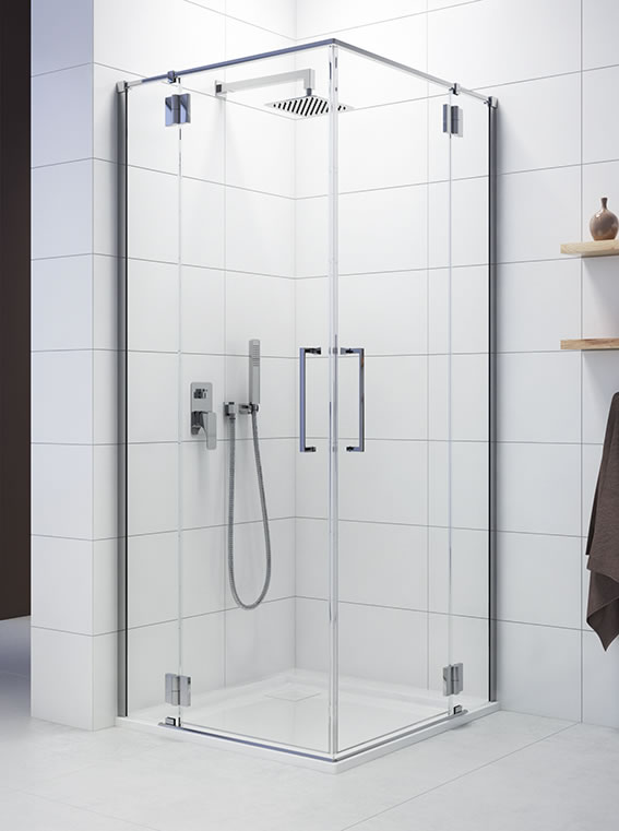 Dusjhjørne med doble dører. Glasspartiene i dusjkabinettet er laget av herdet sikkerhetsglass (6 mm glass i døren 8 mm glass i festeveggene) med glassbeskyttelse. Glassbeskyttelsen GLASS PROTECT er en overflatebehandling som gjør at vannet renner av lettere og etterlater seg lite kalk og smudd. Tett dørlukking er garantert av magnetiske dørlister. Modellen er tilgjengelig i flere kvadratiske og rektangulære størrelser.