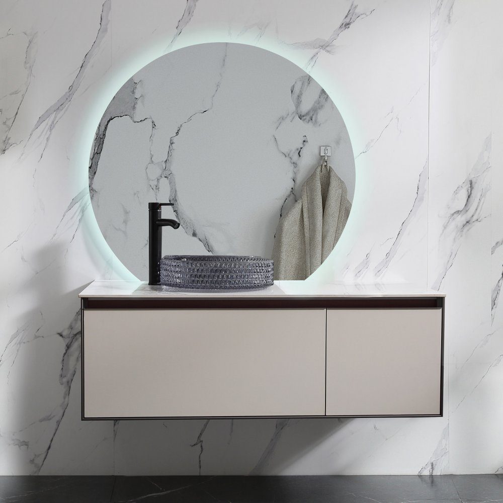 Rundt speil med innebygd LED-belysning som kan brukes både stående mot veggen eller veggmontert. Den rammeløse designen gir jevn bakgrunnsbelysning rundt kanten av speilet. Speilglasset er kobberfritt for økt motstand mot oksidasjon og har en tykkelse på 5 mm.
