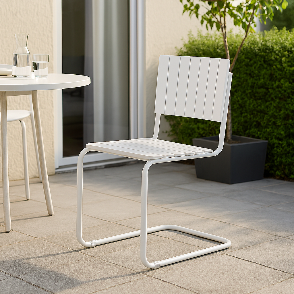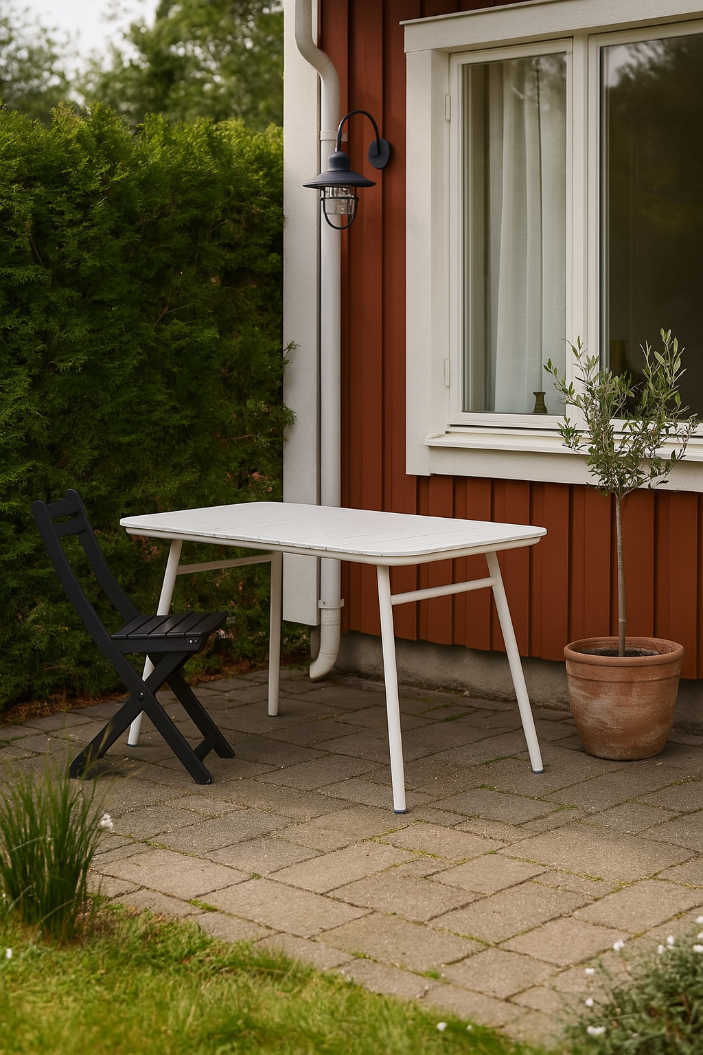Bordplaten er laget av slitesterkt treverk og hviler på en stabil hvitlakkert metallramme, noe som gjør bordet både værbestandig og vedlikeholdsfritt. De stabelbare stolene er laget av det samme slitesterke materialet og følger bordets rene designlinjer. Sammen skaper de en funksjonell og stilig utegruppe som kan romme hele selskapet.
