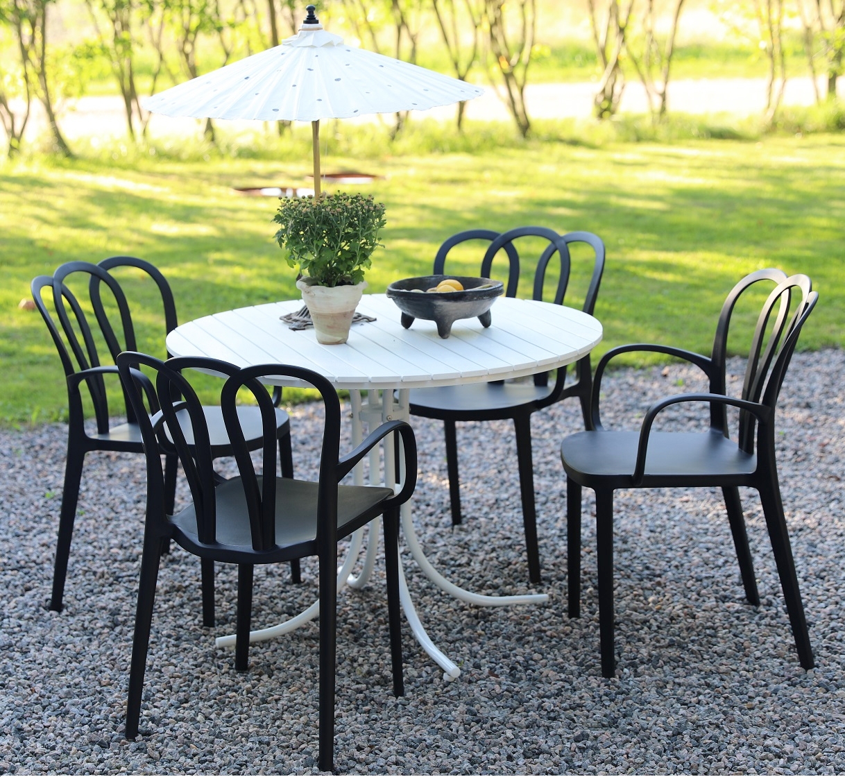 En pen spisegruppe til uteplassen. Holmsund rundt spisebord Ø103 cm i diameter med hvitlakkert understell og hvit aintwood topplate. Med spisegruppen følger det 4 stk. stablebare Thornet karmstoler i svart formstøpt plast. En spisegruppe i harmoni der møblene går pent sammen og gir en uovertruffen helhetsfølelse. Passer like godt i hagestuen som på balkongen.