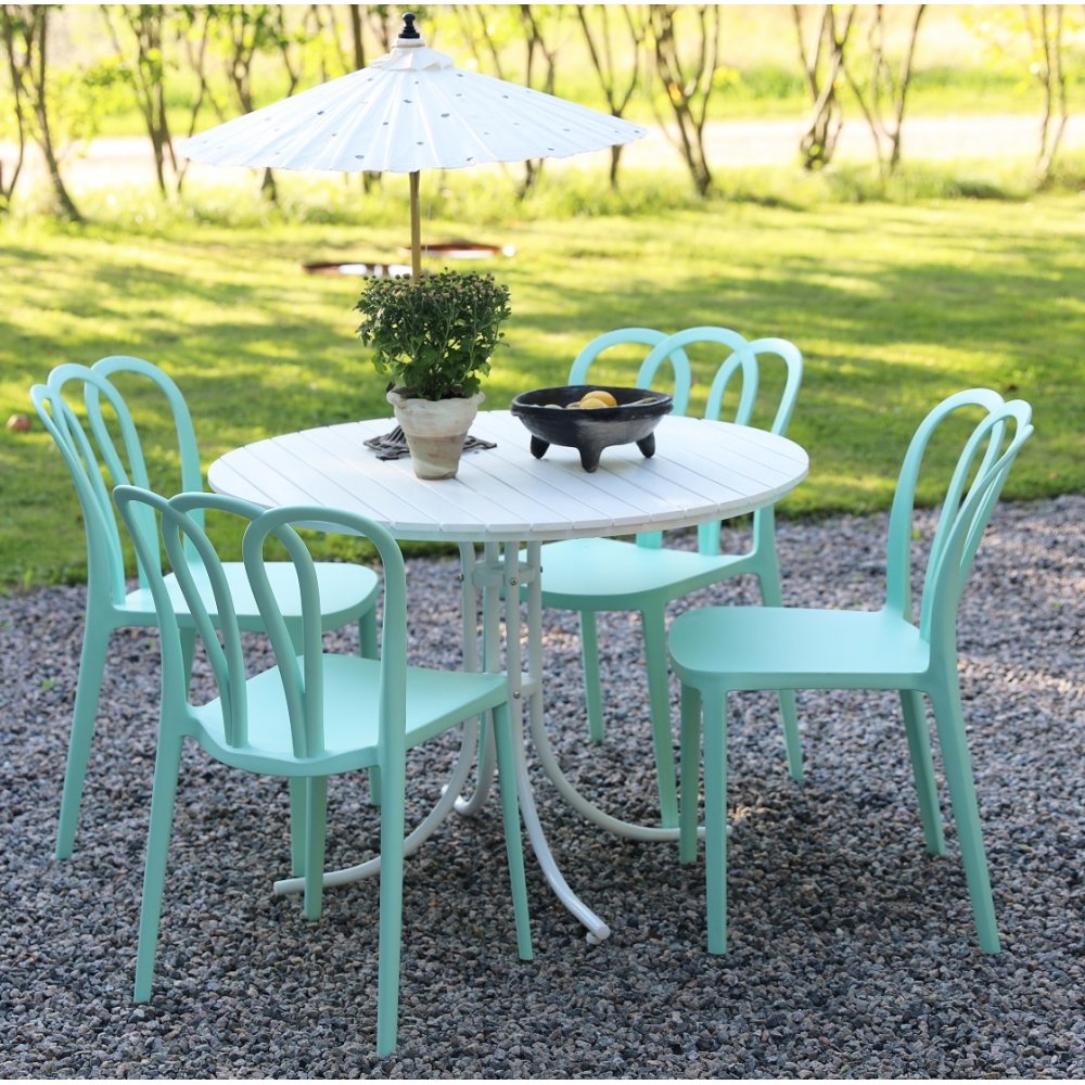 En pen spisegruppe til uteplassen. Holmsund rundt spisebord Ø103 cm i diameter med hvitlakkert understell og hvit aintwood topplate. Med spisegruppen følger det 4 stk. stablebare Bally-stoler i mintgrønn formstøpt plast. En spisegruppe i harmoni der møblene går pent sammen og gir en uovertruffen helhetsfølelse. Passer like godt i hagestuen som på balkongen.