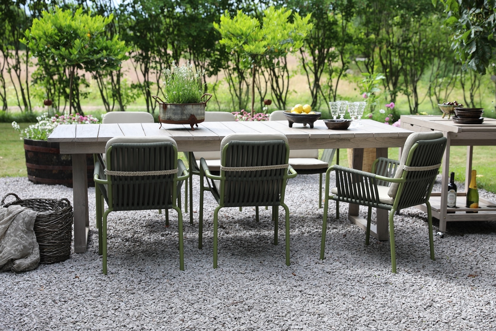Stor spisegruppe til uteplassen, Saltö 240 cm langt bord i grålakkert teak med 6 stk. matchende Lincoln stabelbare utestoler i grønnlakkert aluminium med beige puter. En spisegruppe i harmoni der møblene går pent sammen og gir en uovertruffen helhetsfølelse. Passer like godt i hagestuen som på balkongen.