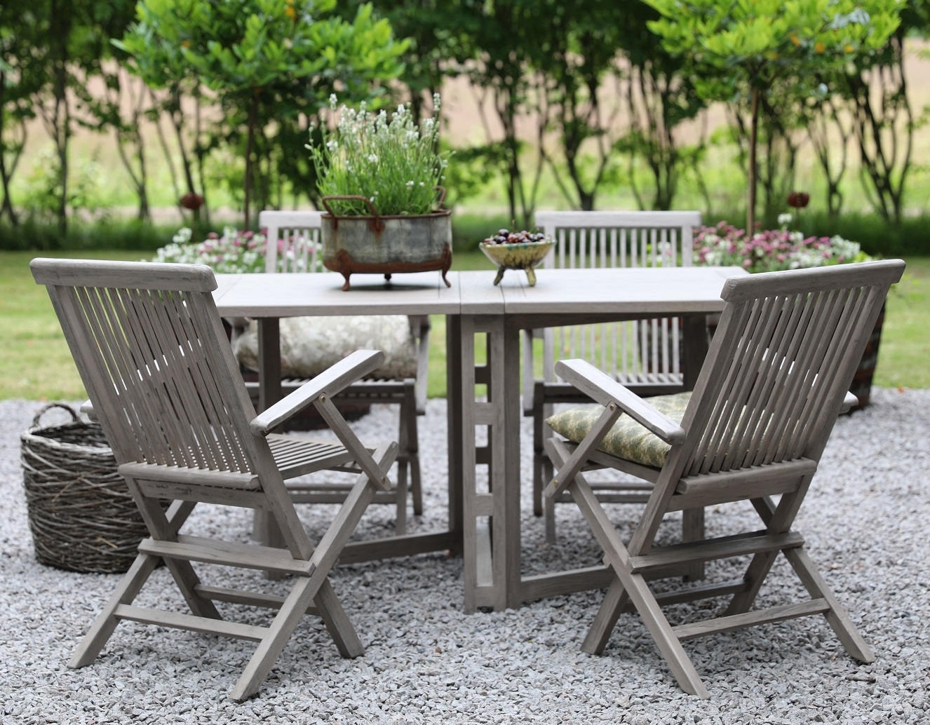 En fin spisegruppe til uteplassen, Saltö klaffbord i grålakkert teak med 4 stk. Saltö karmstoler i grålakkert teak. En spisegruppe i harmoni der møblene går pent sammen og gir en uovertruffen helhetsfølelse. Passer like godt i hagestuen som på balkongen.