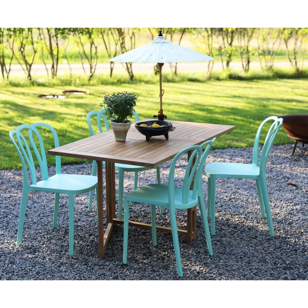 En pen spisegruppe til uteplassen. Saltö klaffbord i teak med 4 stk. stablebare Bally-stoler i mintgrønn formstøpt plast. En spisegruppe i harmoni der møblene går pent sammen og gir en uovertruffen helhetsfølelse. Passer like godt i hagestuen som på balkongen.