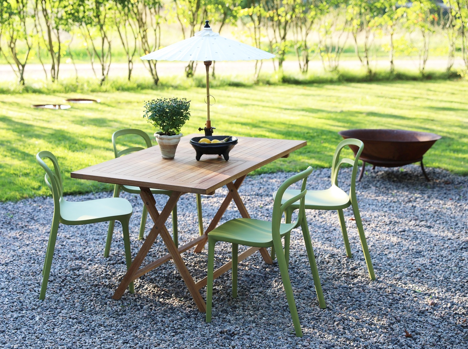 En pen spisegruppe til uteplassen. Saltö klaffbord i teak med 4 stk. stablebare Nordanå-stoler i grønn formstøpt plast. En spisegruppe i harmoni der møblene går pent sammen og gir en uovertruffen helhetsfølelse. Passer like godt i hagestuen som på balkongen.
