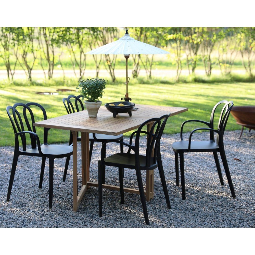 En pen spisegruppe til uteplassen. Saltö klaffbord i teak med 4 stk. stablebare Thornet karmstoler i svart formstøpt plast. En spisegruppe i harmoni der møblene går pent sammen og gir en uovertruffen helhetsfølelse. Passer like godt i hagestuen som på balkongen.