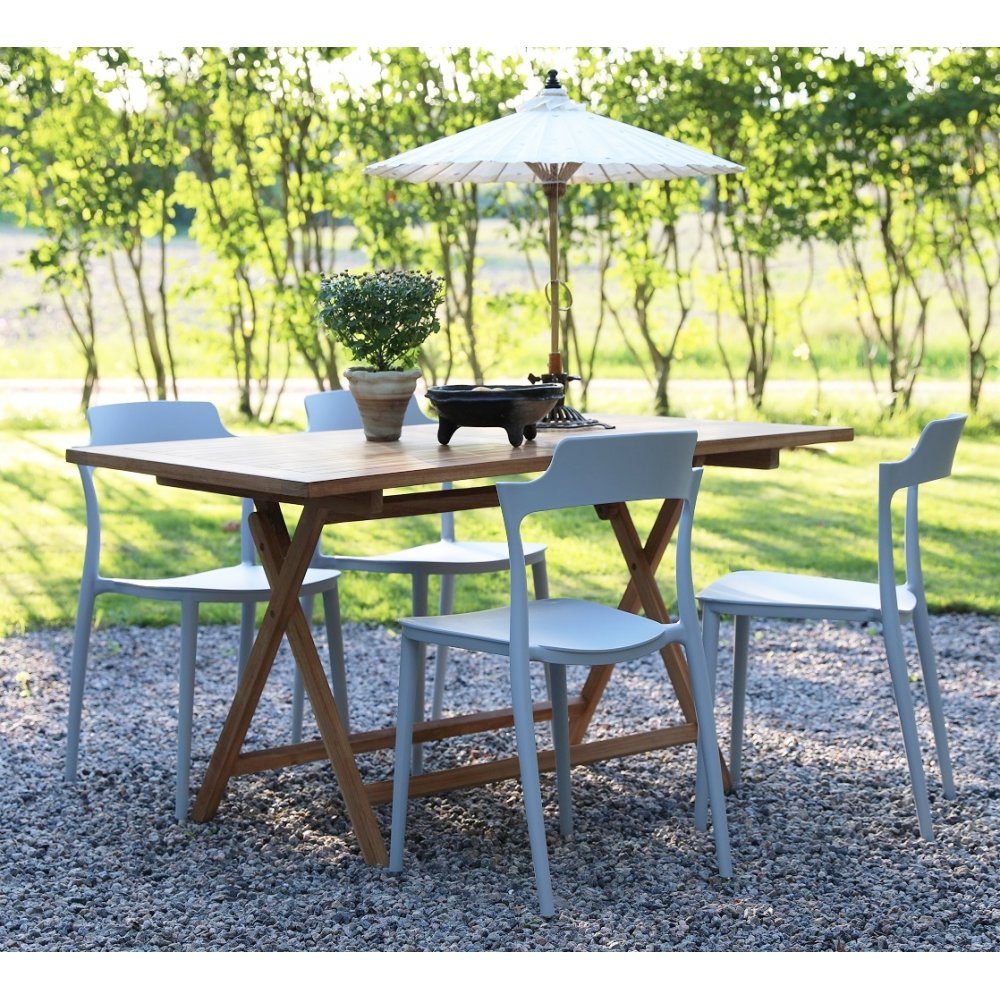 En pen spisegruppe til uteplassen. Saltö klaffbord i teak med 4 stk. stablebare Abbe-stoler i lys grå formstøpt plast. En spisegruppe i harmoni der møblene går pent sammen og gir en uovertruffen helhetsfølelse. Passer like godt i hagestuen som på balkongen.