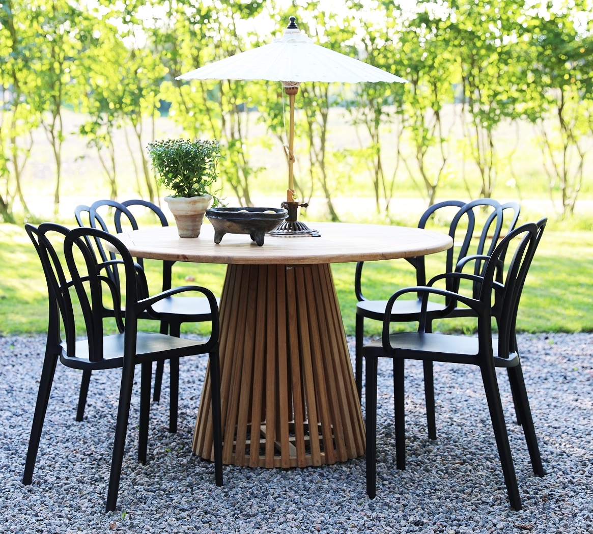 En pen spisegruppe til uteplassen. Saltö rundt spisebord i teak med 4 stk. stablebare Thornet karmstoler i svart formstøpt plast. En spisegruppe i harmoni der møblene går pent sammen og gir en uovertruffen helhetsfølelse. Passer like godt i hagestuen som på balkongen.