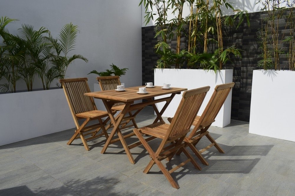 Spisegruppe med sammenleggbart bord og stoler som passer utmerket til hage og altan.