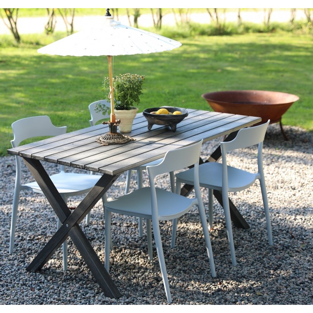En pen spisegruppe til uteplassen. Scottsdale spisebord i grålasert furu med 4 stk. stablebare Abbe-stoler i lys grå formstøpt plast. En spisegruppe i harmoni der møblene går pent sammen og gir en uovertruffen helhetsfølelse. Passer like godt i hagestuen som på balkongen.