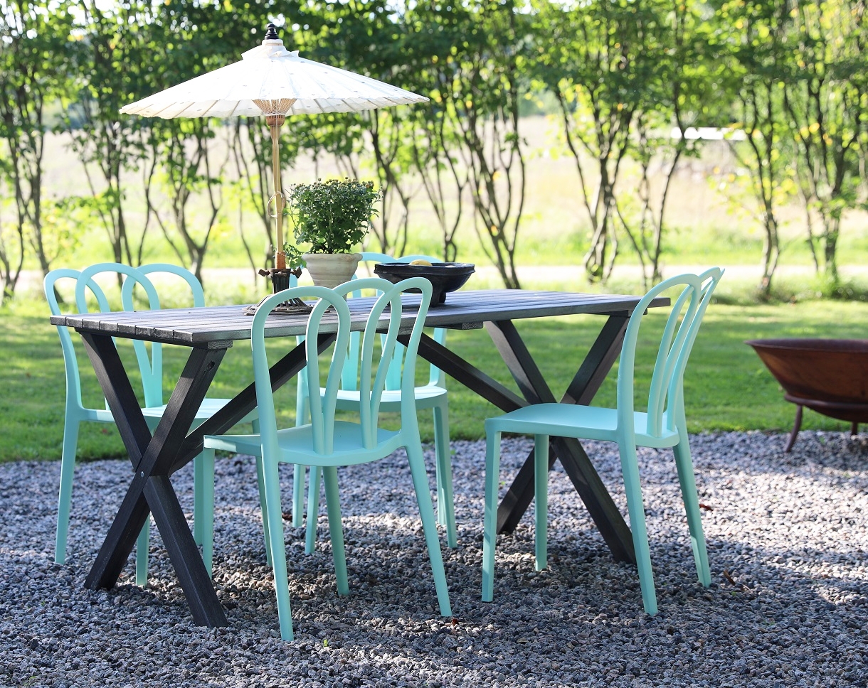 En pen spisegruppe til uteplassen. Scottsdale spisebord i grålasert furu med 4 stk. stablebare Bally-stoler i mintgrønn formstøpt plast. En spisegruppe i harmoni der møblene går pent sammen og gir en uovertruffen helhetsfølelse. Passer like godt i hagestuen som på balkongen.