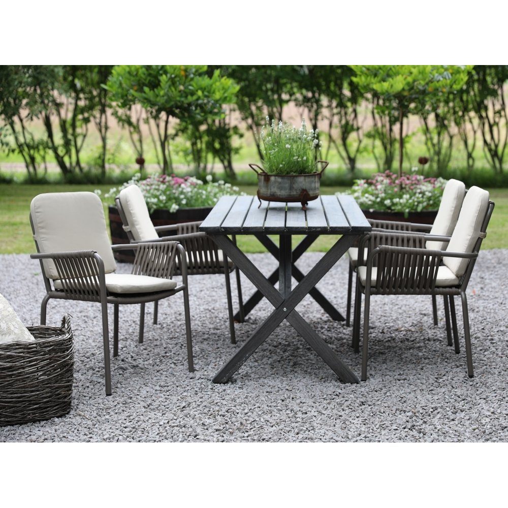 Spisegruppe for utemøbler, 150 cm langt bord i grålasert furu med kryssben og 4 stk. matchende Lincoln-stoler i grålakkert aluminium med beige pute. Stolene kan stables og er dermed lette å oppbevare. En spisegruppe i harmoni der møblene går pent sammen og gir en uovertruffen helhetsfølelse. Passer like godt i hagestuen som på verandaen.