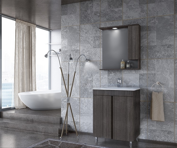 Square møbelpakke fra Nordamist med et gulvstående servantskap i mørkegrå eikefinish, porselensplate og en speilenhet med skap og en spotlight.