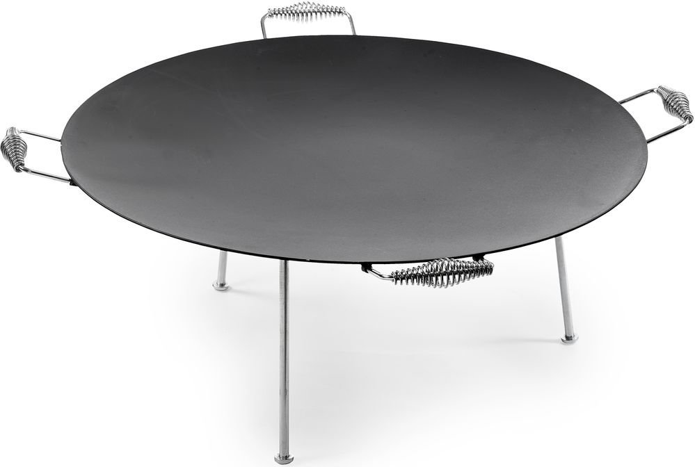 Stekehelle laget av 4 mm varmvalset stål. 3 stk. avtagbare ben inkludert. Håndtak på fire sider av stekehellen for enkel flytting.