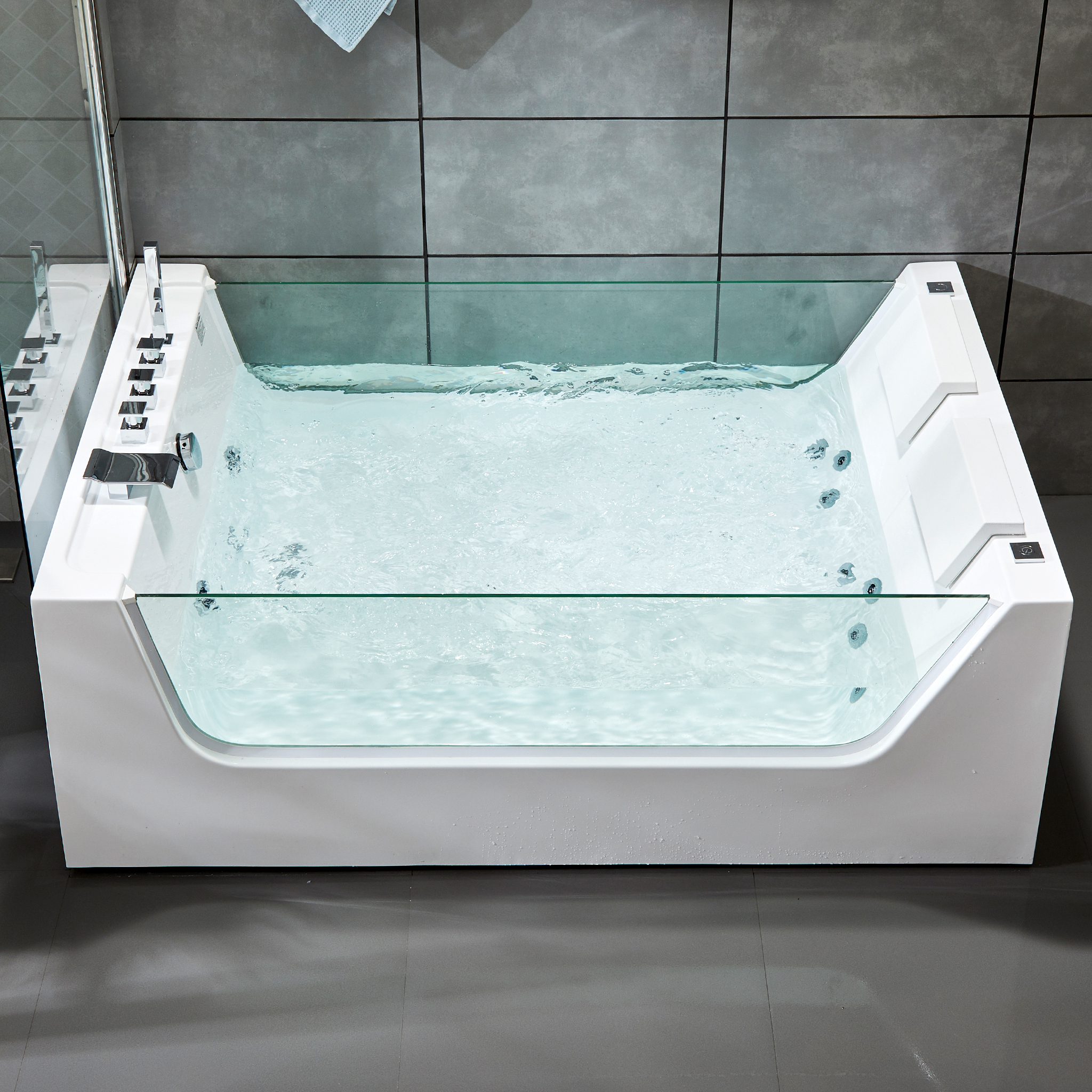 Boblebad med innebygd varmeovn i et eksklusivt og imponerende design med en bredde på 120 cm, som gir god plass til 2 personer. Sidene er laget av ekstra tykt 12 mm gjennomsiktig glass. Badekarets design gjør at det kan plasseres frittstående eller inntil en vegg/hjørne. For maksimal holdbarhet er badekaret laget av 100 % ren, slitesterk akryl av høy kvalitet . Akryl er et materiale som isolerer godt og dermed holder på varmen fra badevannet i lang tid. Materialet er ikke-porøst, noe som gir en myk og glatt overflate i badekaret. Den glatte overflaten er veldig enkel å rengjøre.
