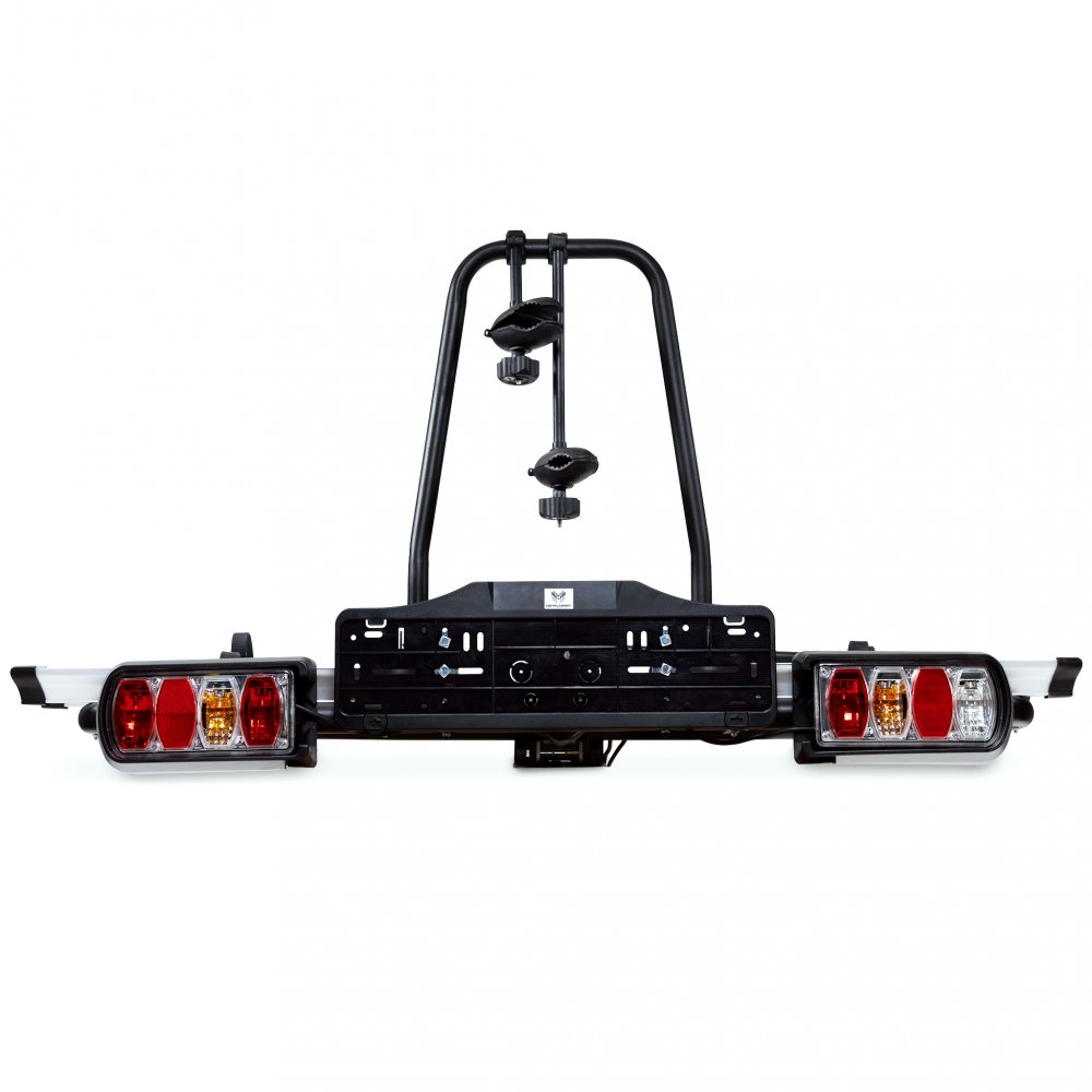 Dette sykkelstativet er spesielt utviklet for å håndtere den høyere vekten til elsykler. Den har plass til to sykler med en total lastekapasitet på 60 kg og er utstyrt med baklykter for sikker transport selv i mørket. Takket være den integrerte låsefunksjonen er både syklene og selve holderen beskyttet mot tyveri.