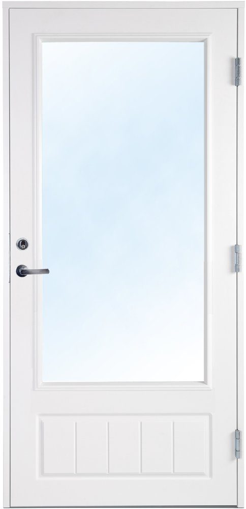 Døren har dekor på både nederste inn- og utside. Vinduet består av 2-lags isolerglass med Argon, som gir lav U-verdi. Vinduet i døren er sikkerhetsglass, som er anbefalt av Plan- og bygningsetaten for vinduer mindre enn 60 cm fra bakken.