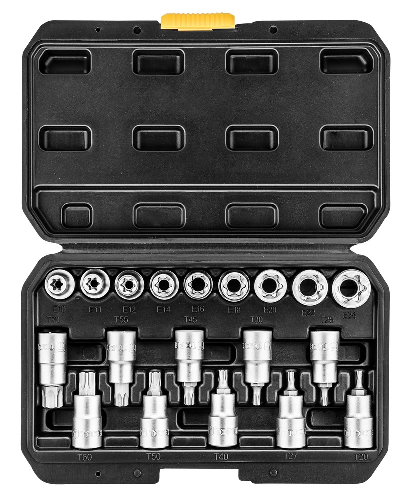 Sett med 9 torxhylser og 10 torxbitshylser, sortert i en praktisk boks. Laget av slitesterkt CrV-stål.