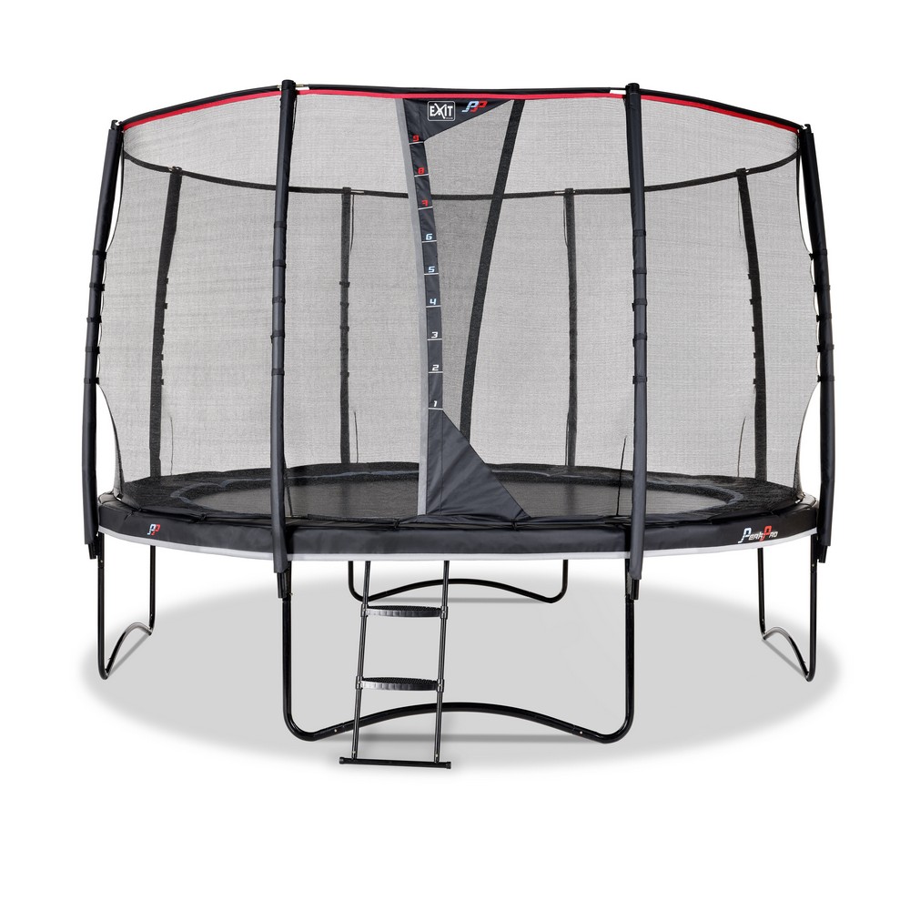 PeakPro med sikkerhetsnett er en førsteklasses trampoline, med komfortable sprett og stige som følger med. Trampolinen har et robust uttrykk med sort ramme og fjærbeskyttelse.